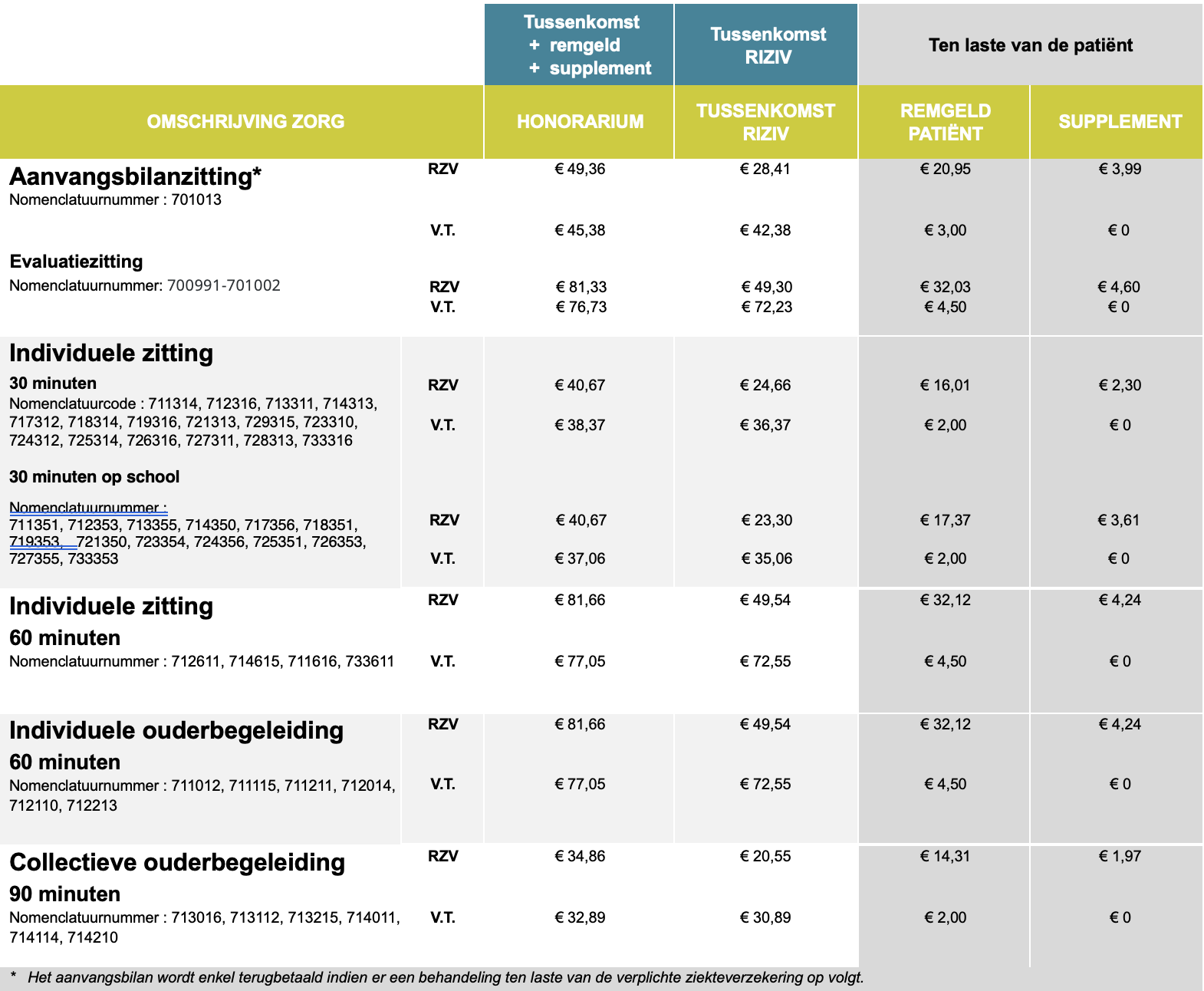 Kleinere problemen vallen soms niet binnen de wettelijke nomenclatuur. Er geldt hiervoor ook een terugbetaling via een forfaitair bedrag, afhankelijk van uw mutualiteit. Neem voor meer info contact op met uw mutualiteit.